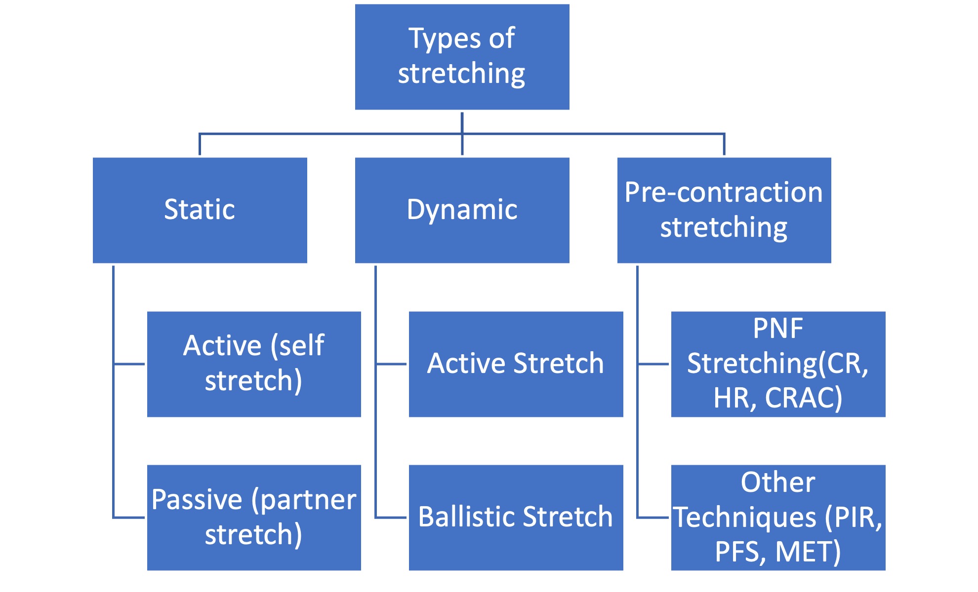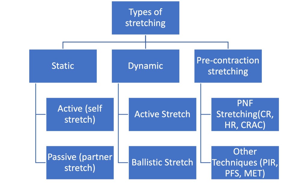 The thinking around stretching evolves constantly as researchers understand more and more about how the body reacts to stimuli. I’ve included a small diagram that outlines the different types of stretching, but that area itself merits an entirely specific blog and as such the key component of this blog is to realise the differences in stretches that should be performed during a warmup sequence.