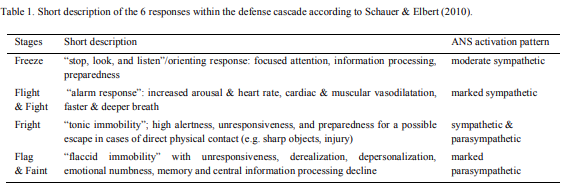I did say that this area has developed though didn’t I, there is a huge body of work in this area which I won’t even attempt to summarise, however, the table below is a good example of where the thinking has evolved. Below you will see that we have events that occur when faced with a threat. In fact, Schauer and Elbert (2010) found that this series of events can occur in a cascade manner, the sympathetic arousal reaching a maximum at the fright stage, and is eventually replaced by the onset of dissociative ‘‘shut-down’’. OK so yes that did sound a bit psychobabbly but the table below should make it fairly straightforward.